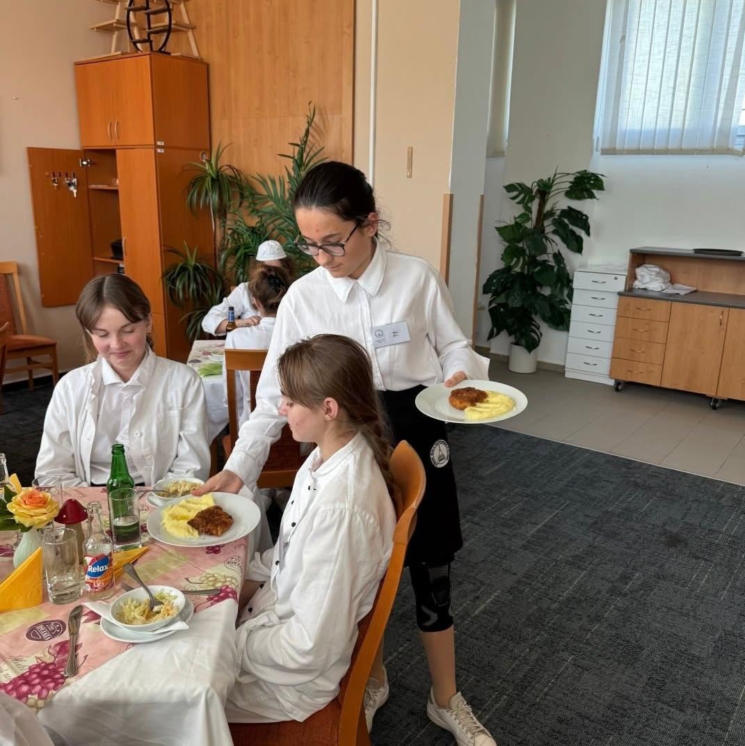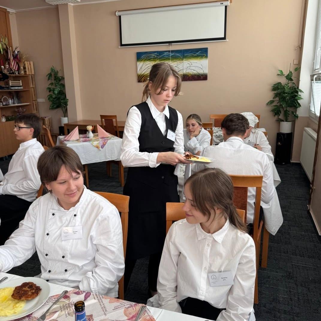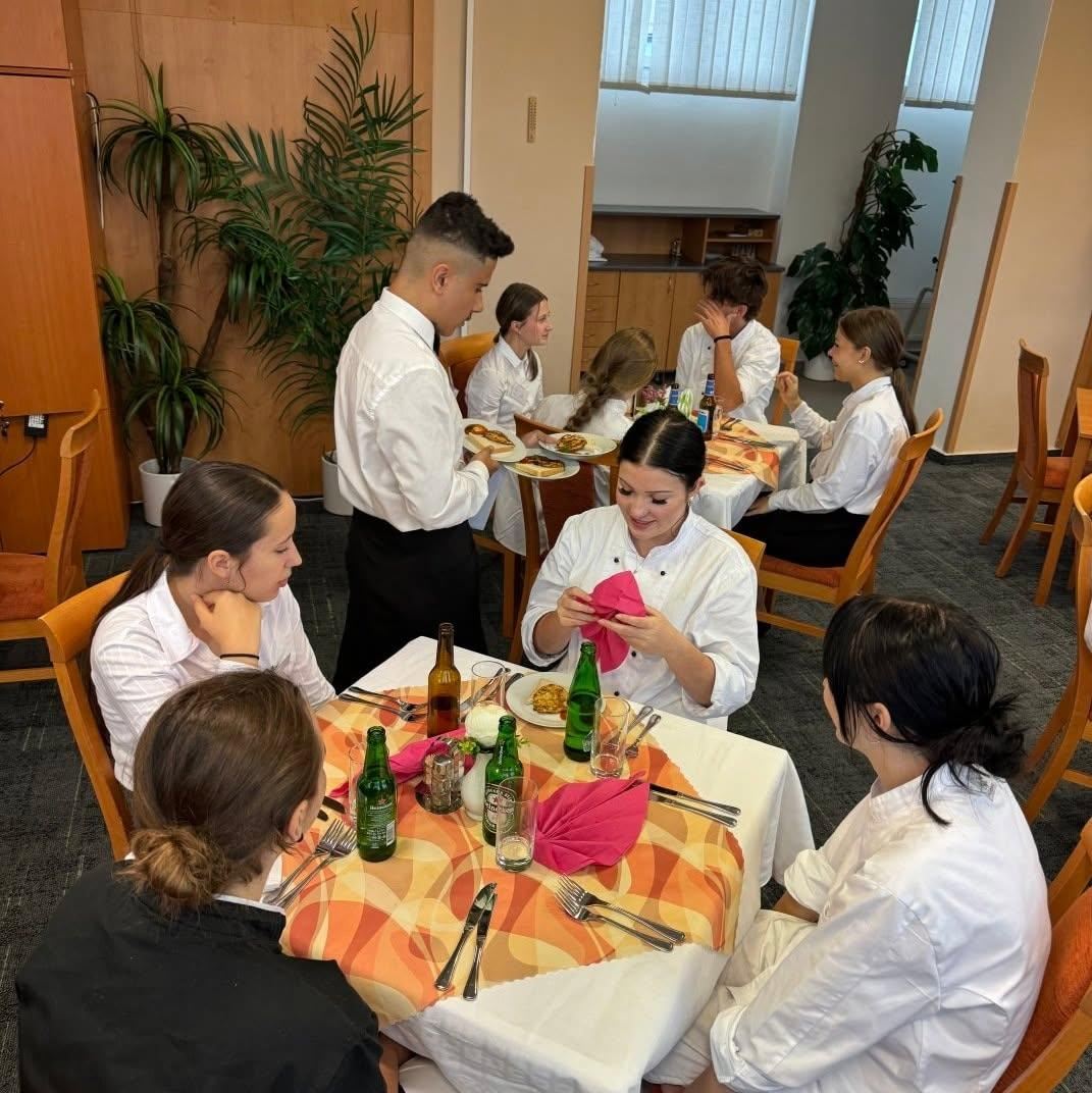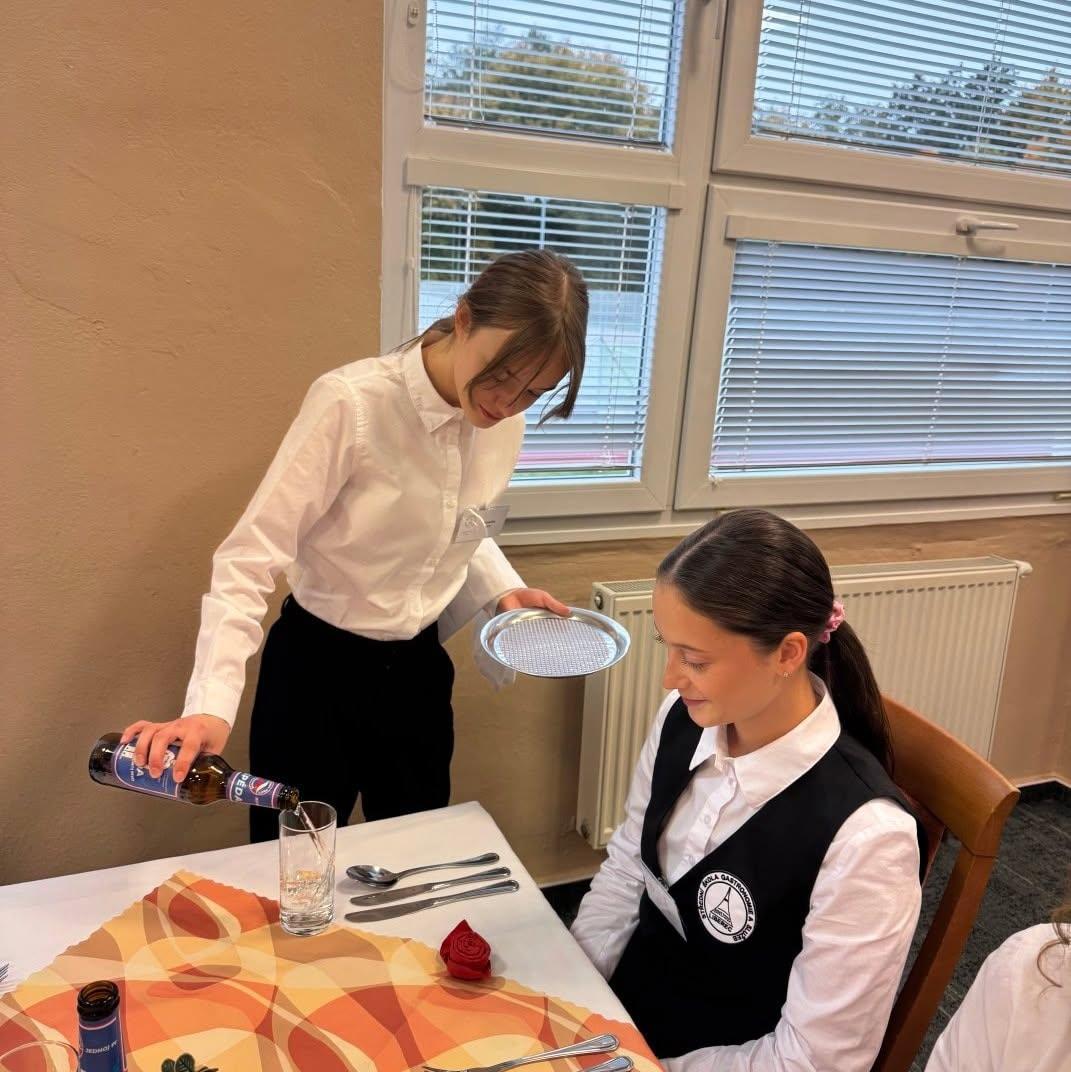 Žáci 1. ročníku oboru Hotelnictví trénují techniku nošení talířů a učí se servis lahvových nápojů 🍷. Každý krok směřuje k profesionální obsluze a skvělému zážitku pro hosta.