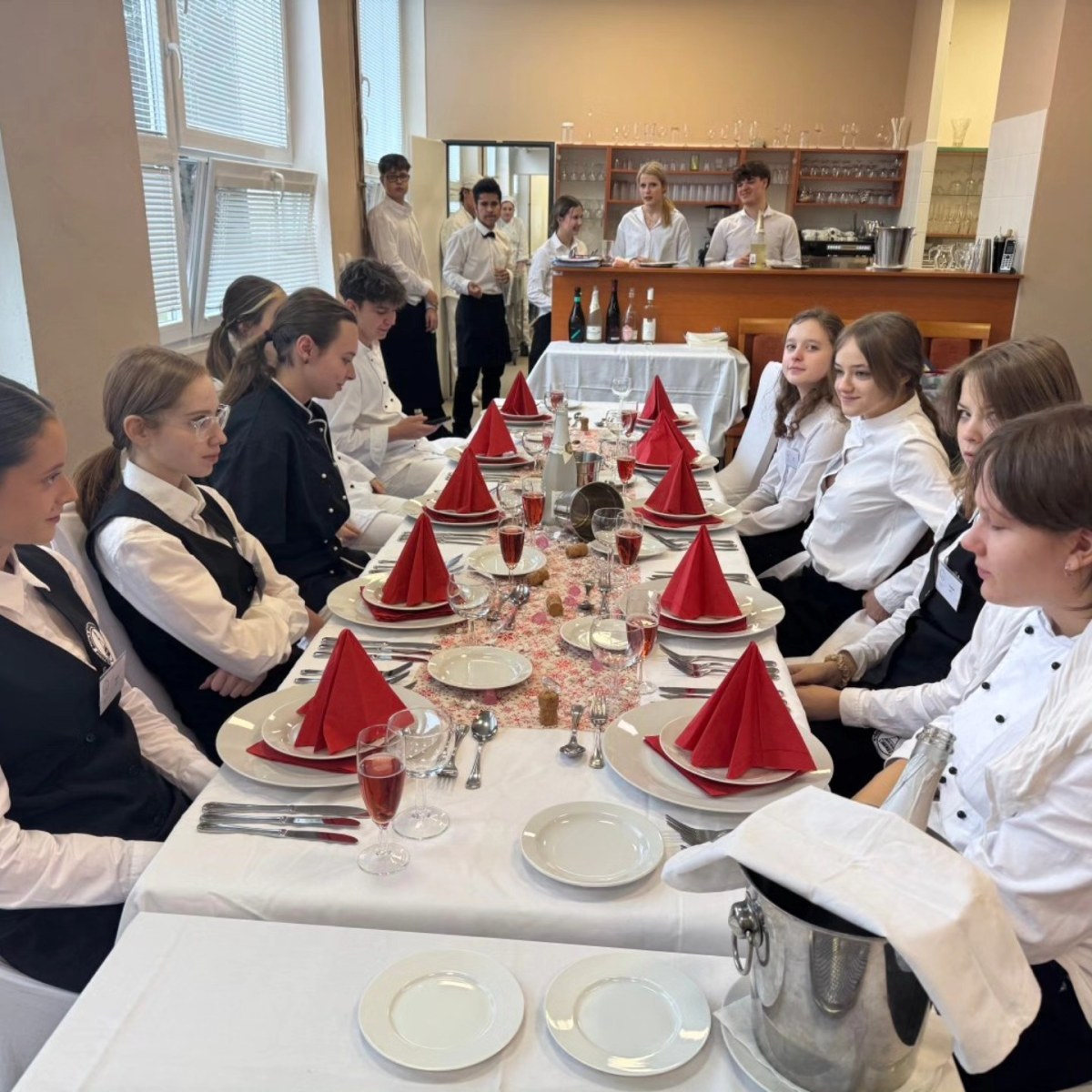 Před prázdninami se žáci prvního ročníku oboru Hotelnictví pustili do trénování překládání pokrmů a poprvé si vyzkoušeli servis hlavního chodu s glošem.