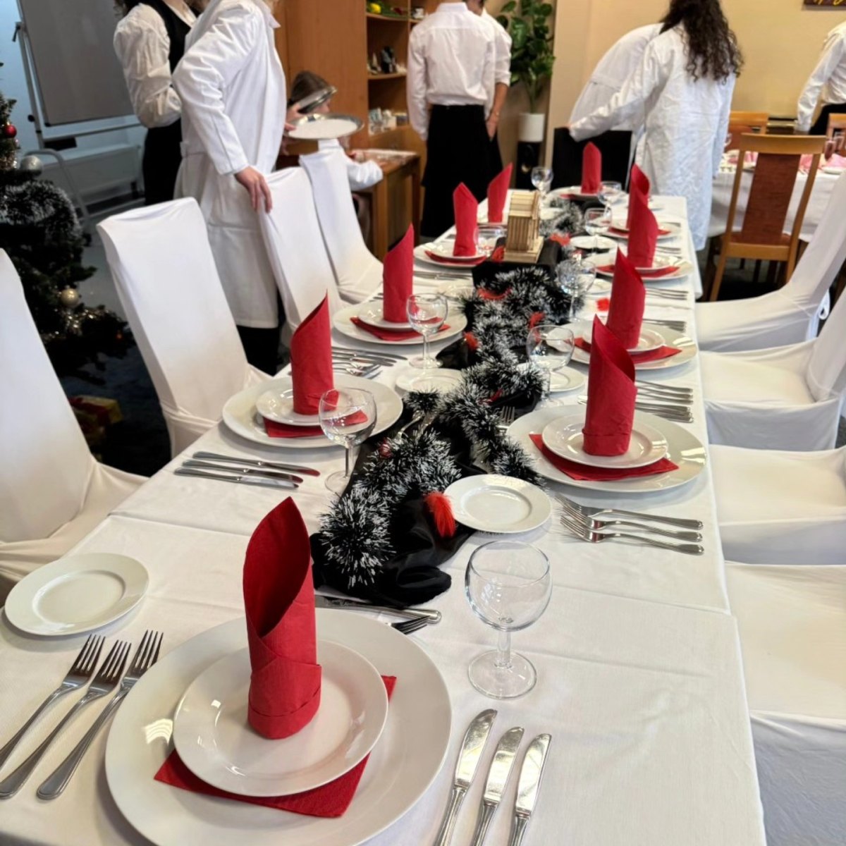 Před prázdninami se žáci prvního ročníku oboru Hotelnictví pustili do trénování překládání pokrmů a poprvé si vyzkoušeli servis hlavního chodu s glošem.