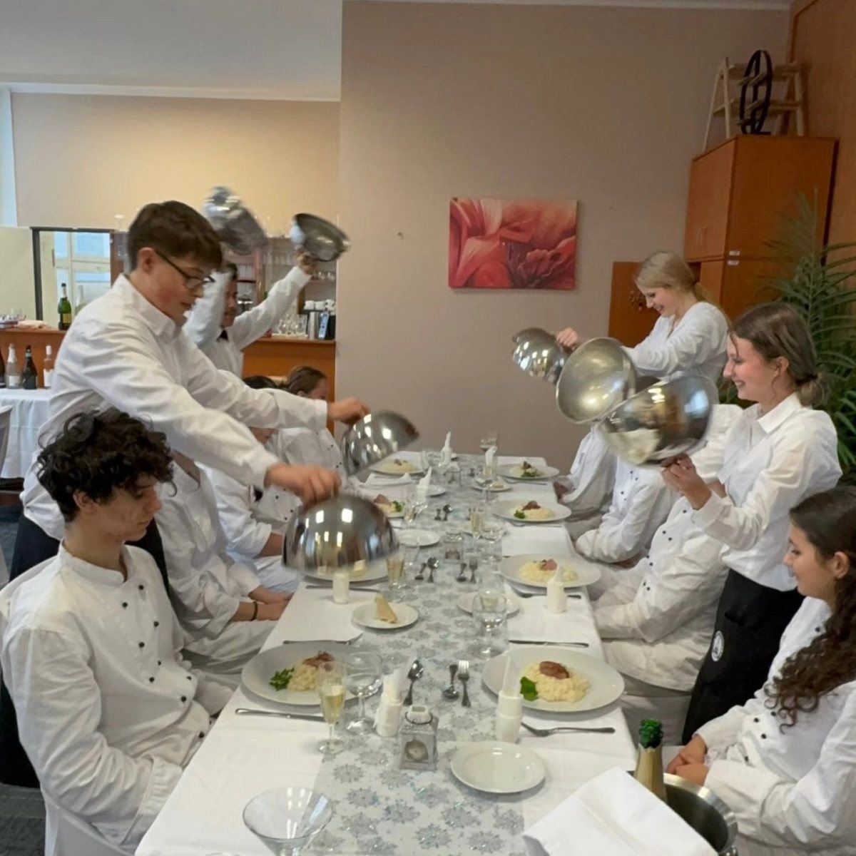 Před prázdninami se žáci prvního ročníku oboru Hotelnictví pustili do trénování překládání pokrmů a poprvé si vyzkoušeli servis hlavního chodu s glošem.