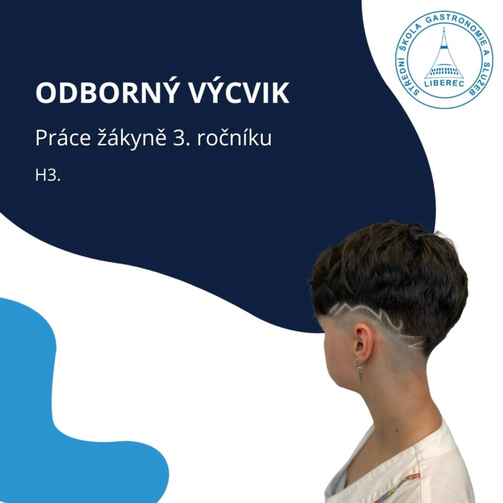 Práce naší žákyně Martiny, 3. ročník. Preparace vlasů, doplněná tónováním do černého odstínu. Náročný střih s ornamenty dle předlohy.